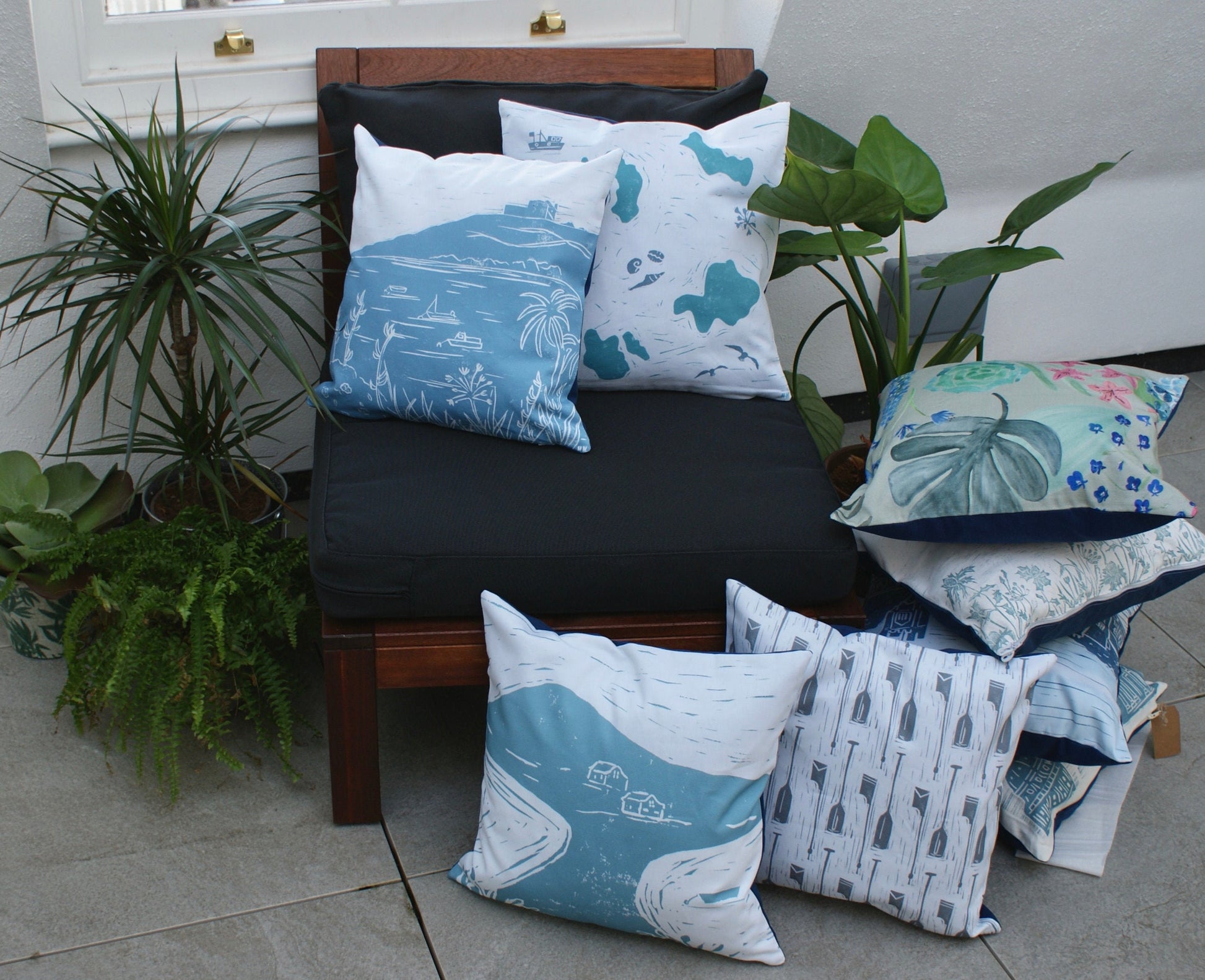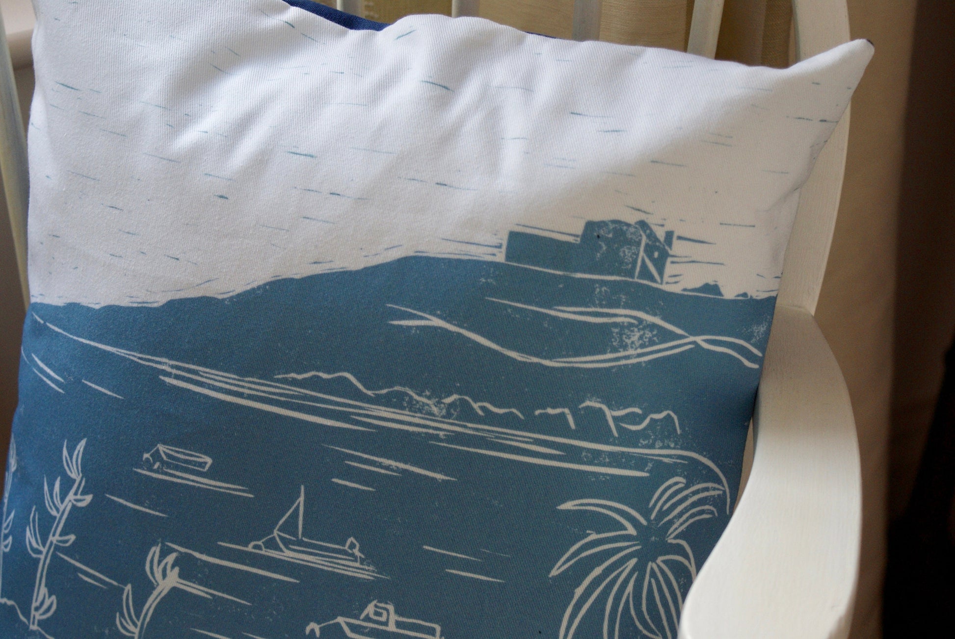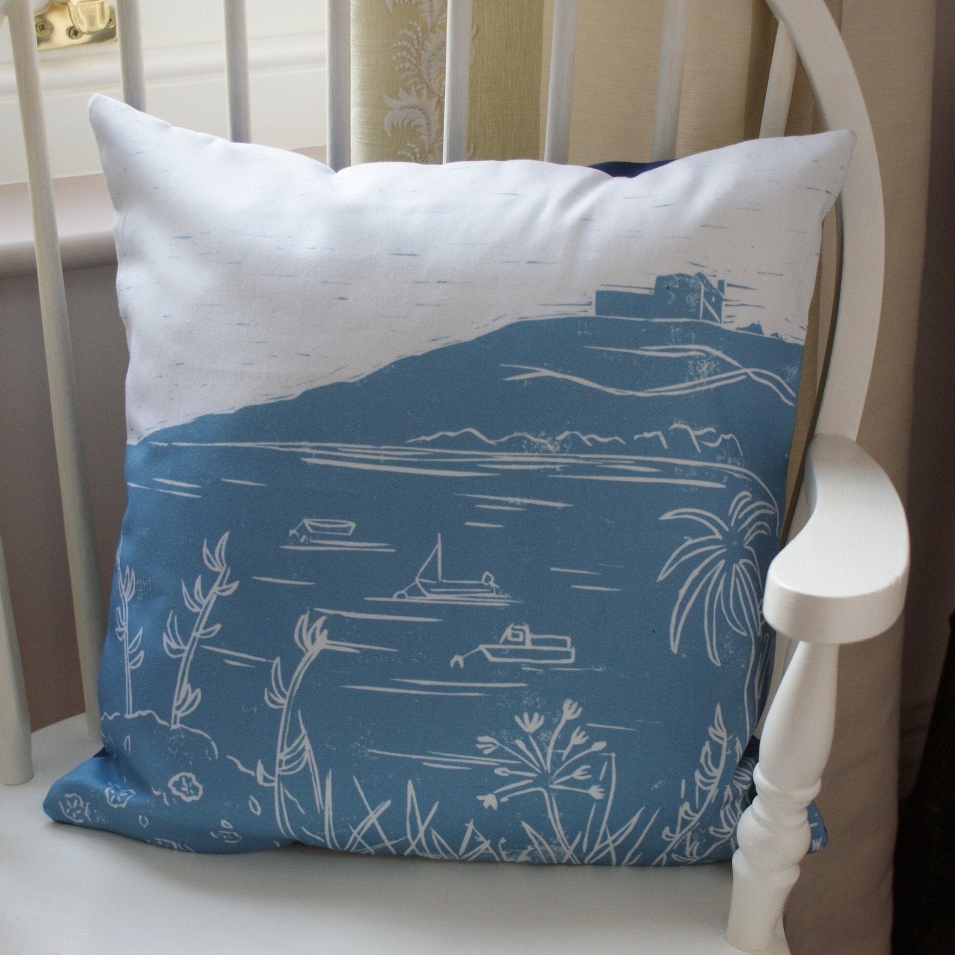 My lino printed cushions draw inspiration from nostalgic scenes, mainly from Cornwall and the Isles of Scilly. This design developed from sketching the view of the old Block House ruins, on Tresco on the Isles of Scilly. The beach below the ancient ruins is my favourite in the world! The design is typically Scilly, and the perfect reminder of Scilly from home.