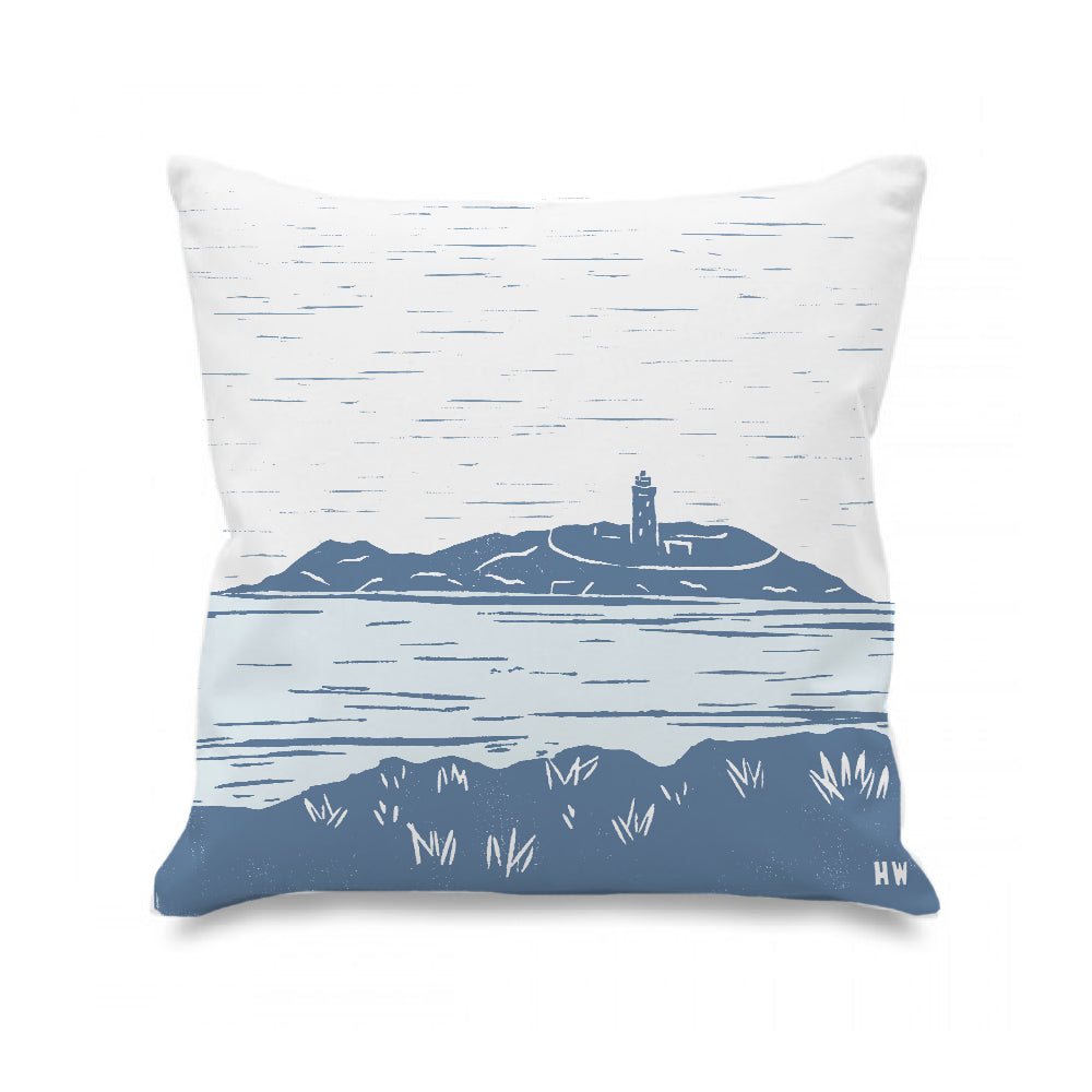 My lino print design showing the gorgeous Godrevy Lighthouse from the Cornish Coastline.