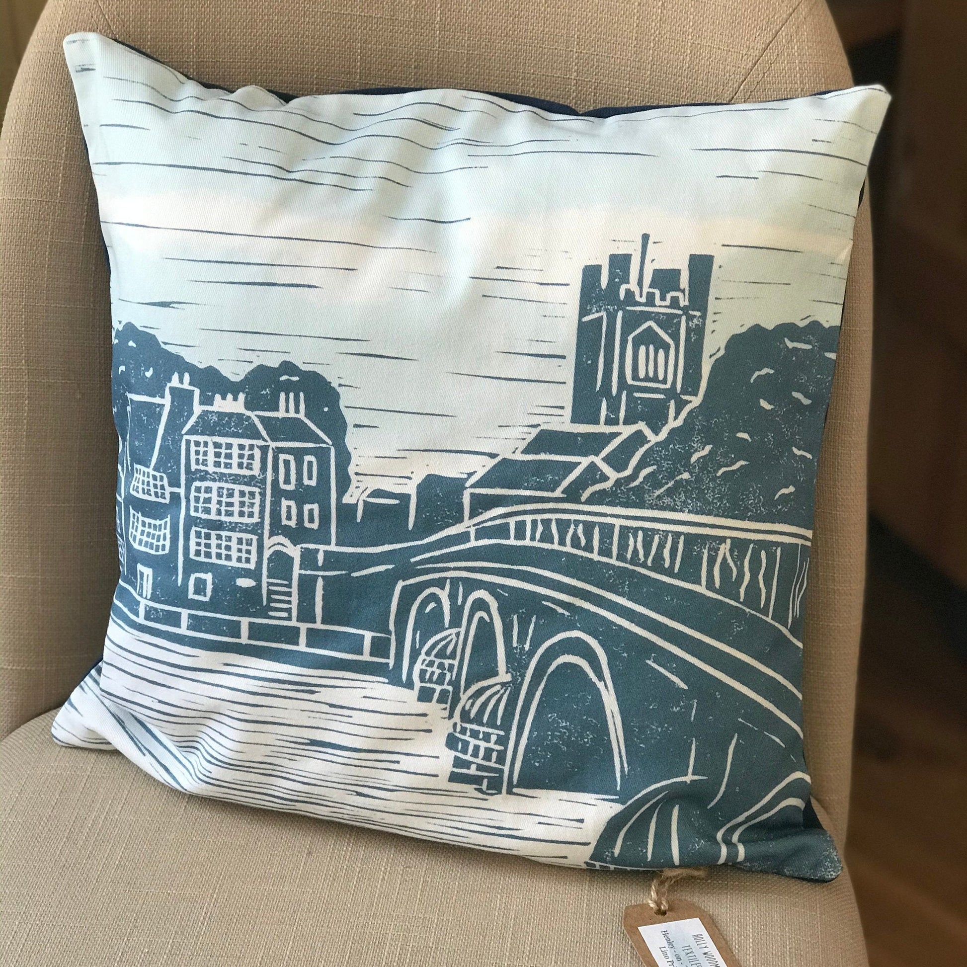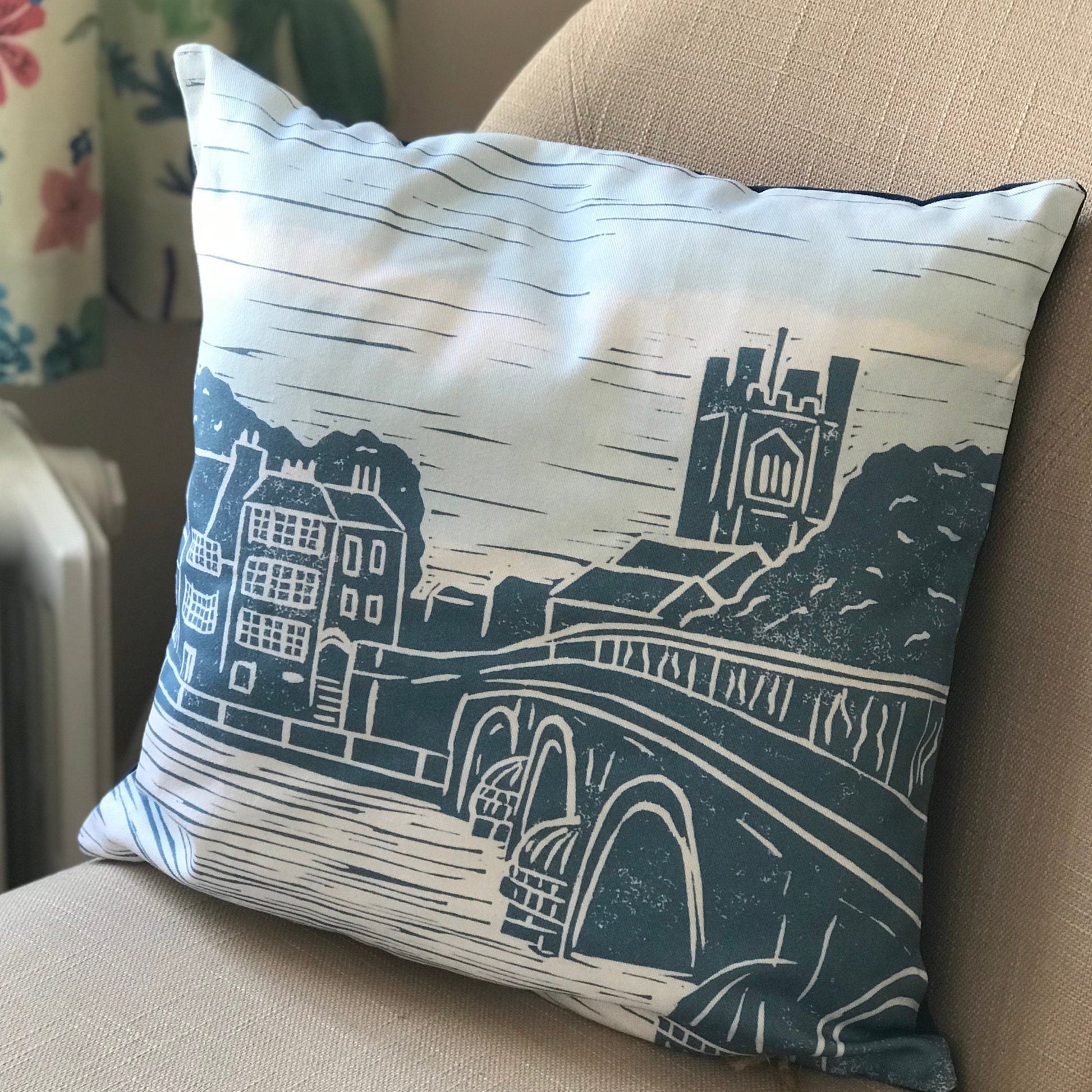 My lino printed cushions draw inspiration from nostalgic scenes. The Henley-on-Thames design draws from my sketches from the pretty market town. It's a bold design perfect for a statement cushion.