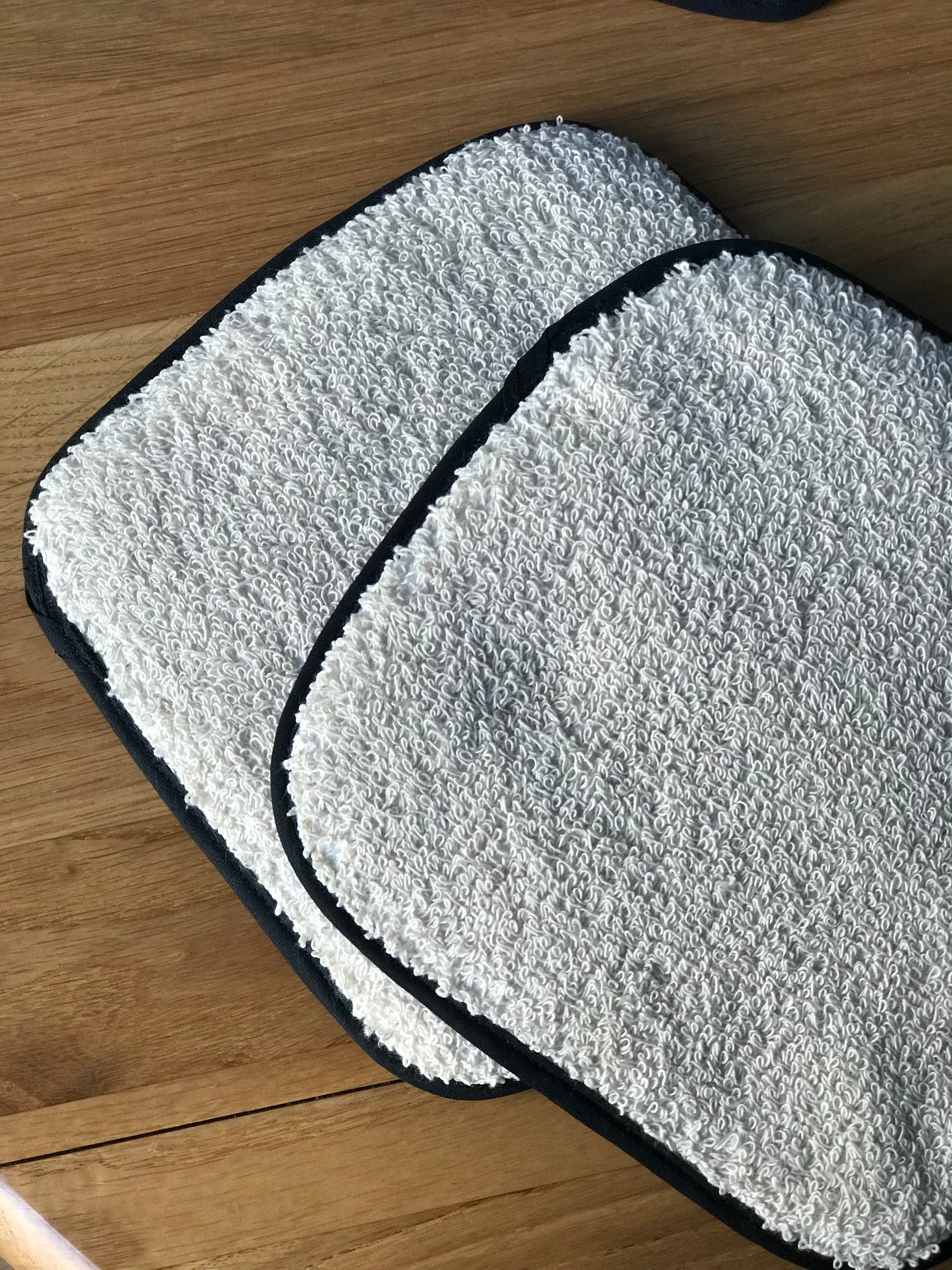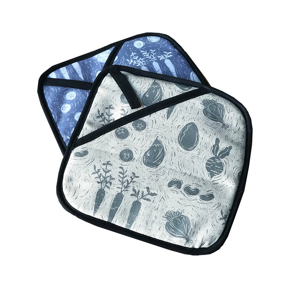These handy pot holders are created from my 'Lino Veggies' print. I work a lot with lino printing and was inspired by all the home cooking this year so created a collection with this print. It also comes in tea towels, hob covers and oven gloves for the perfect kitchen set!
