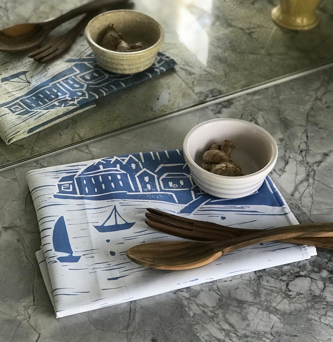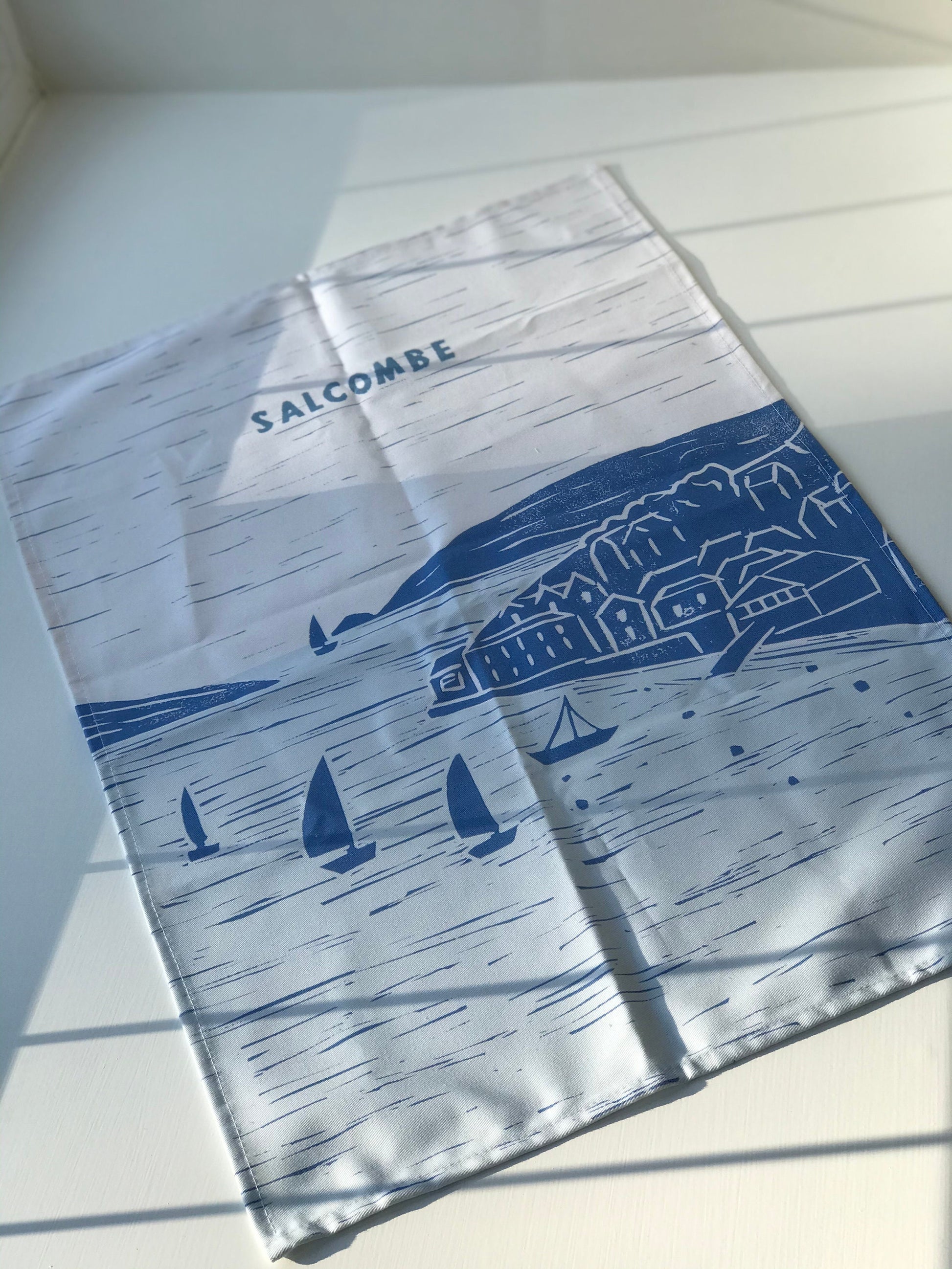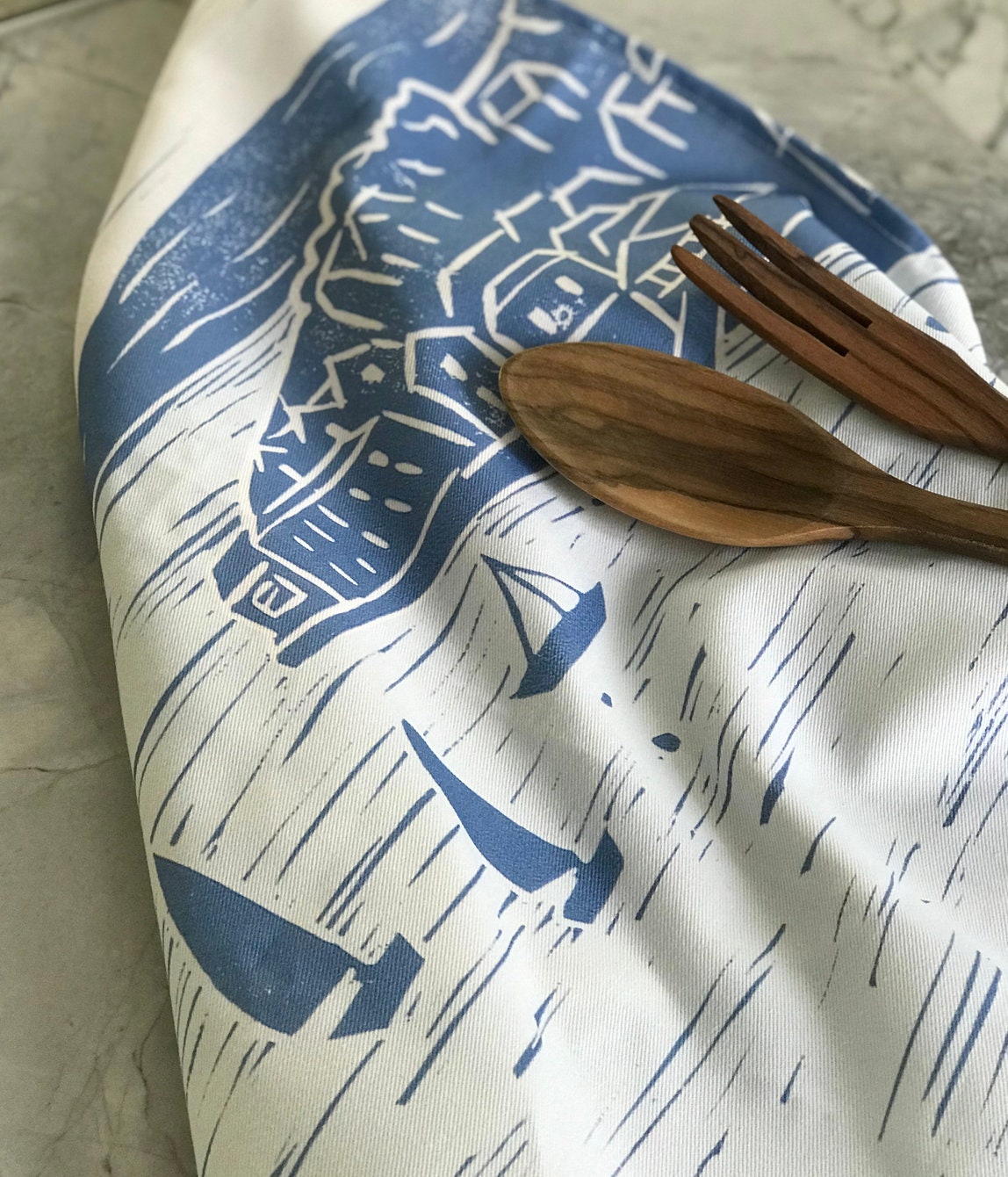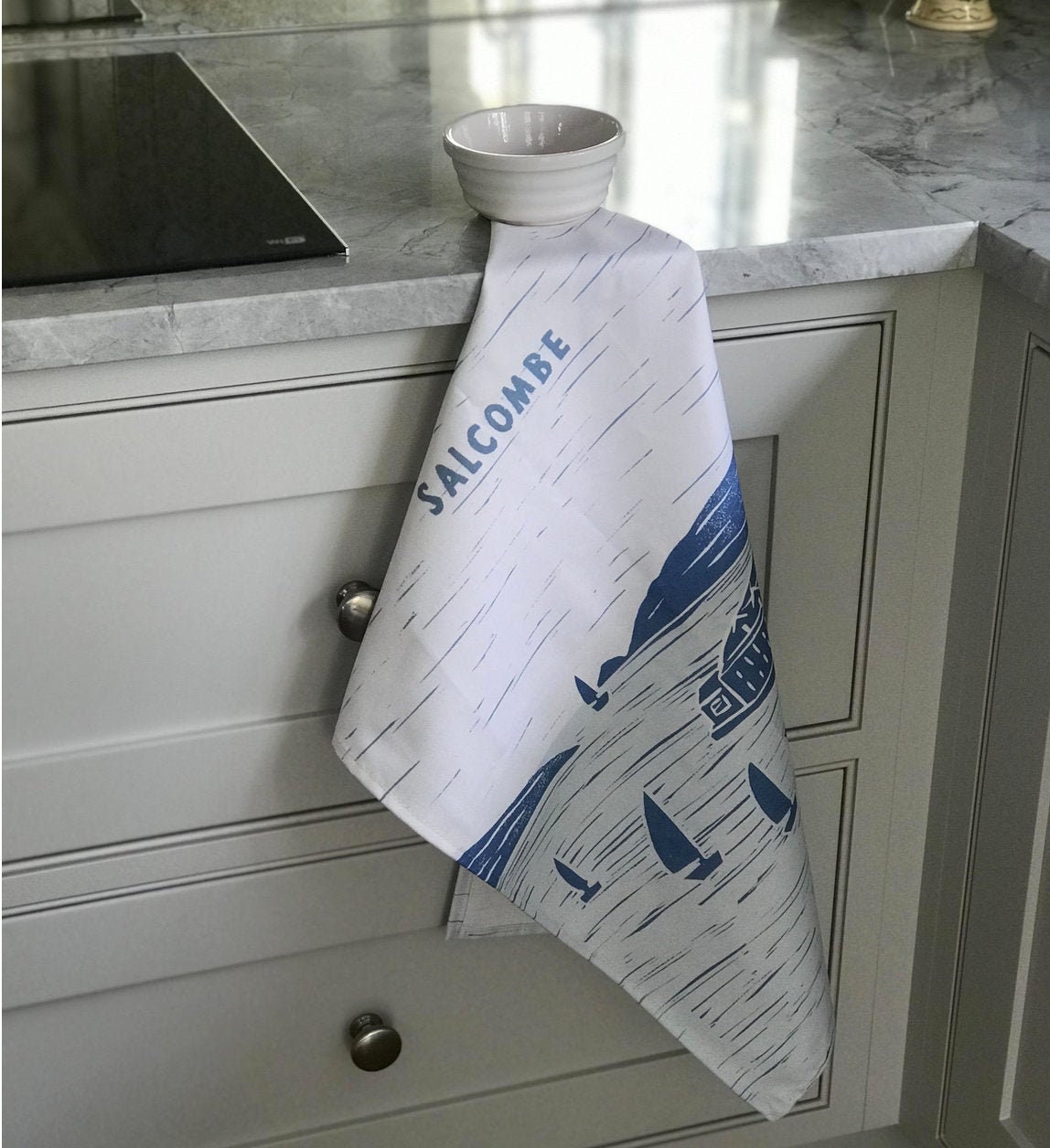This bright cotton tea towel features the beautiful Salcombe Harbour in Devon. A perfect gift for someone with happy memories of the beautiful town. Created from my original lino cut and printed onto crisp white cotton drill.