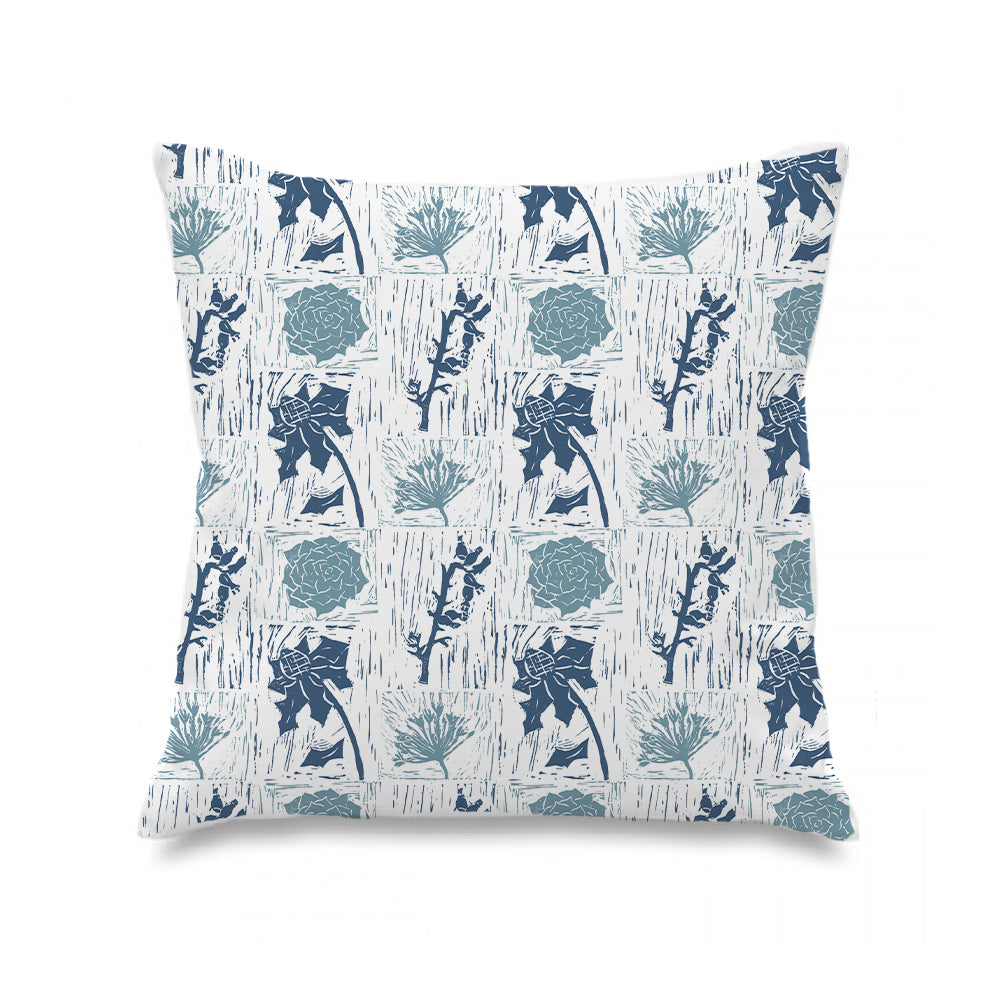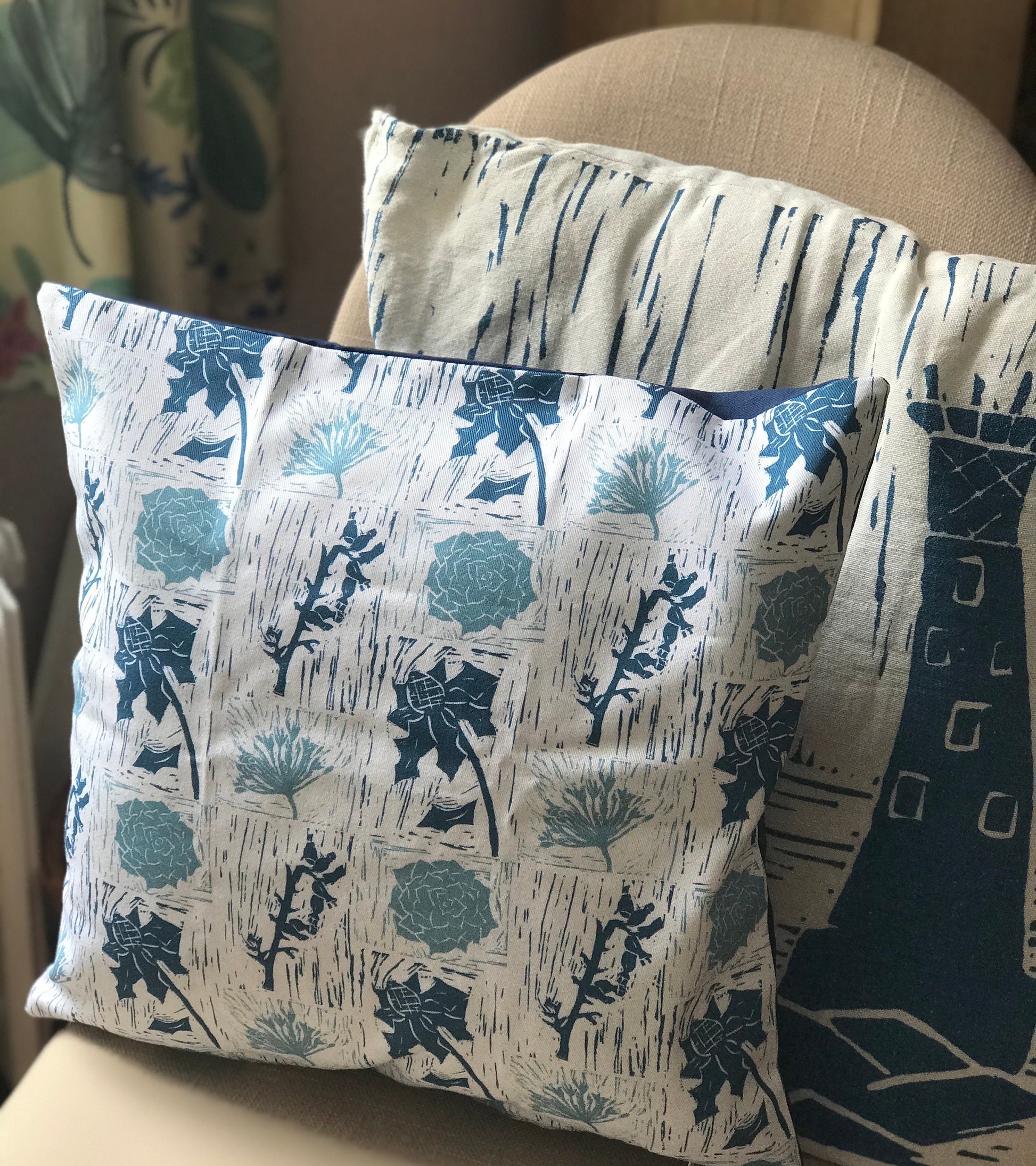 A lino print inspired by Scilly Cornish flora including Agapanthus, Aeonium and Sea Holly. The calming tonal colours make perfect scatter cushions to compliment a room.